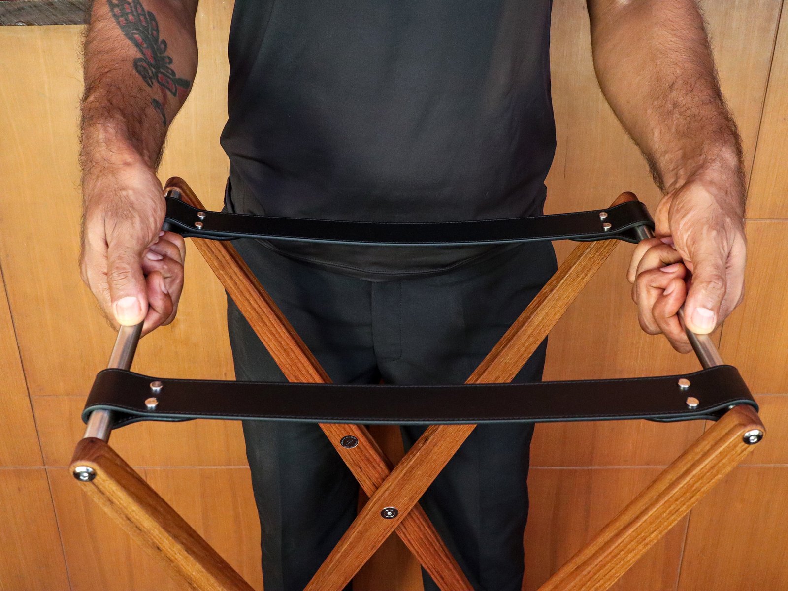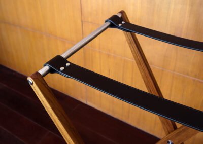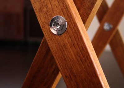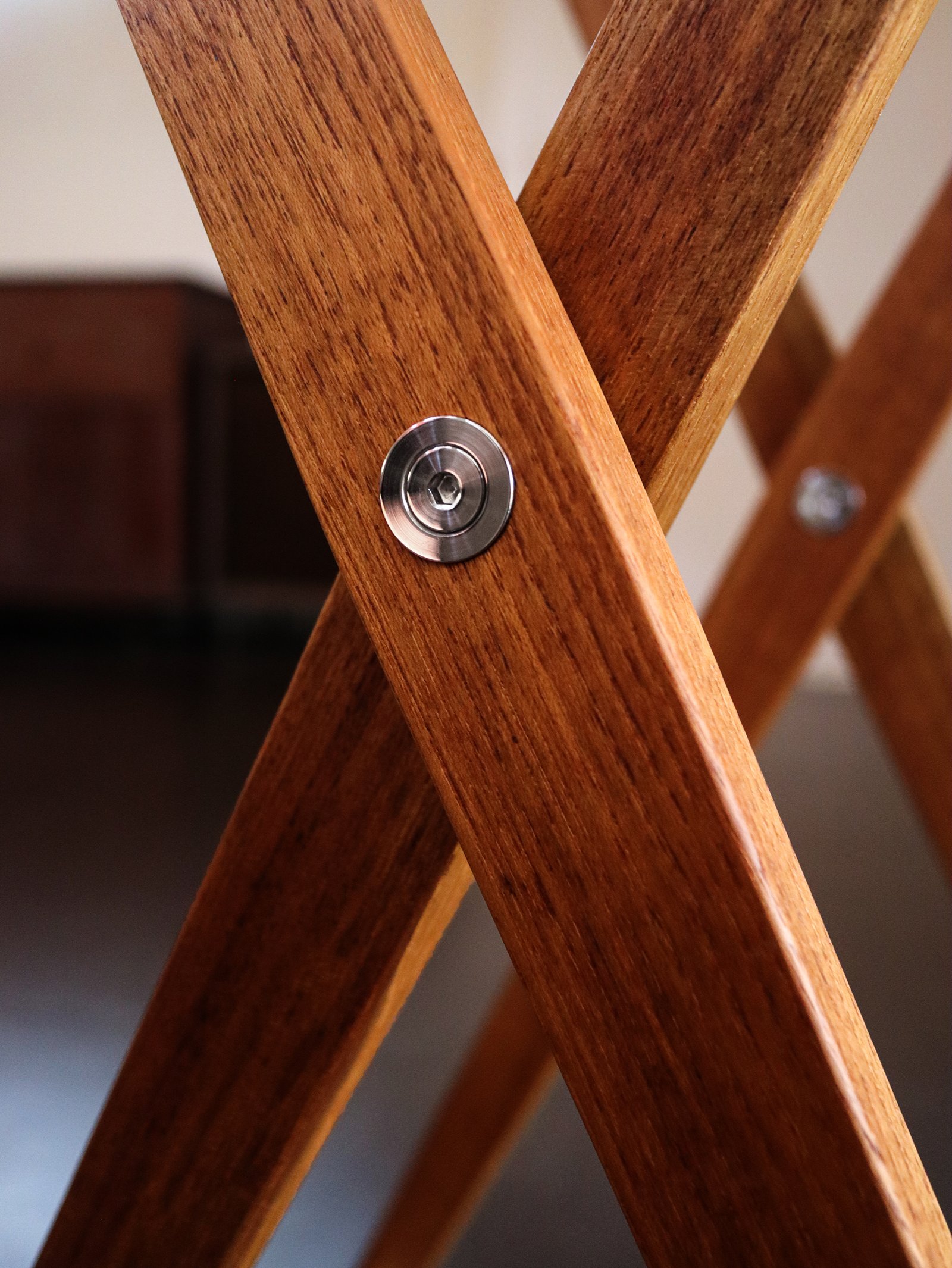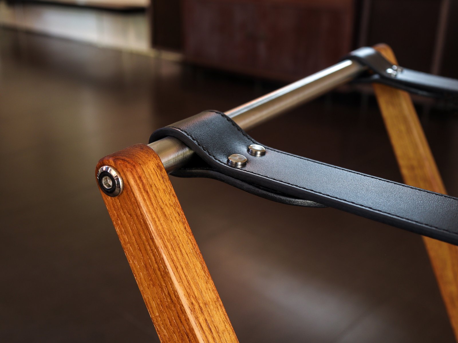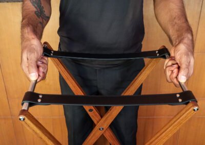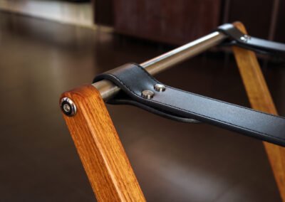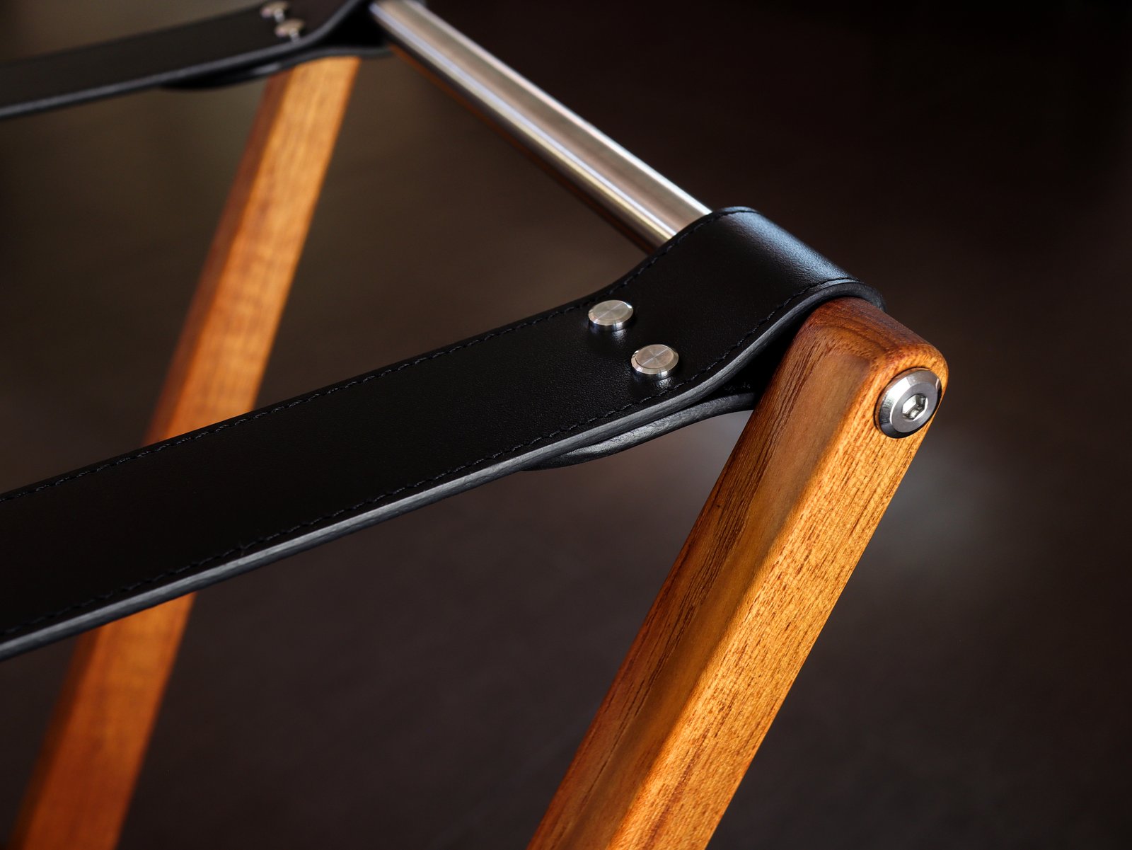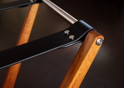I chose polished stainless steel for its clarity and strength, finishing every surface to a mirror polish that recalls the exacting casework of a fine timepiece. The vegetable‑tanned leather straps, thick and resilient, are secured with stainless steel rivets set at precise pressure—functional details that also carry a tactile honesty. For the wooden elements, I used quarter‑sawn golden teak, selected for its stability and luminous grain, cut to reveal its natural precision and enduring beauty.
