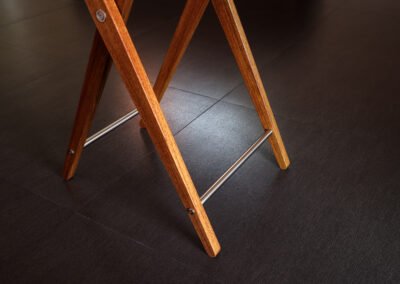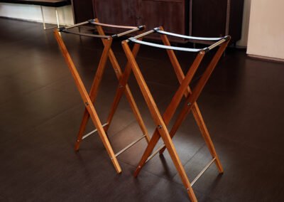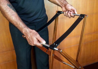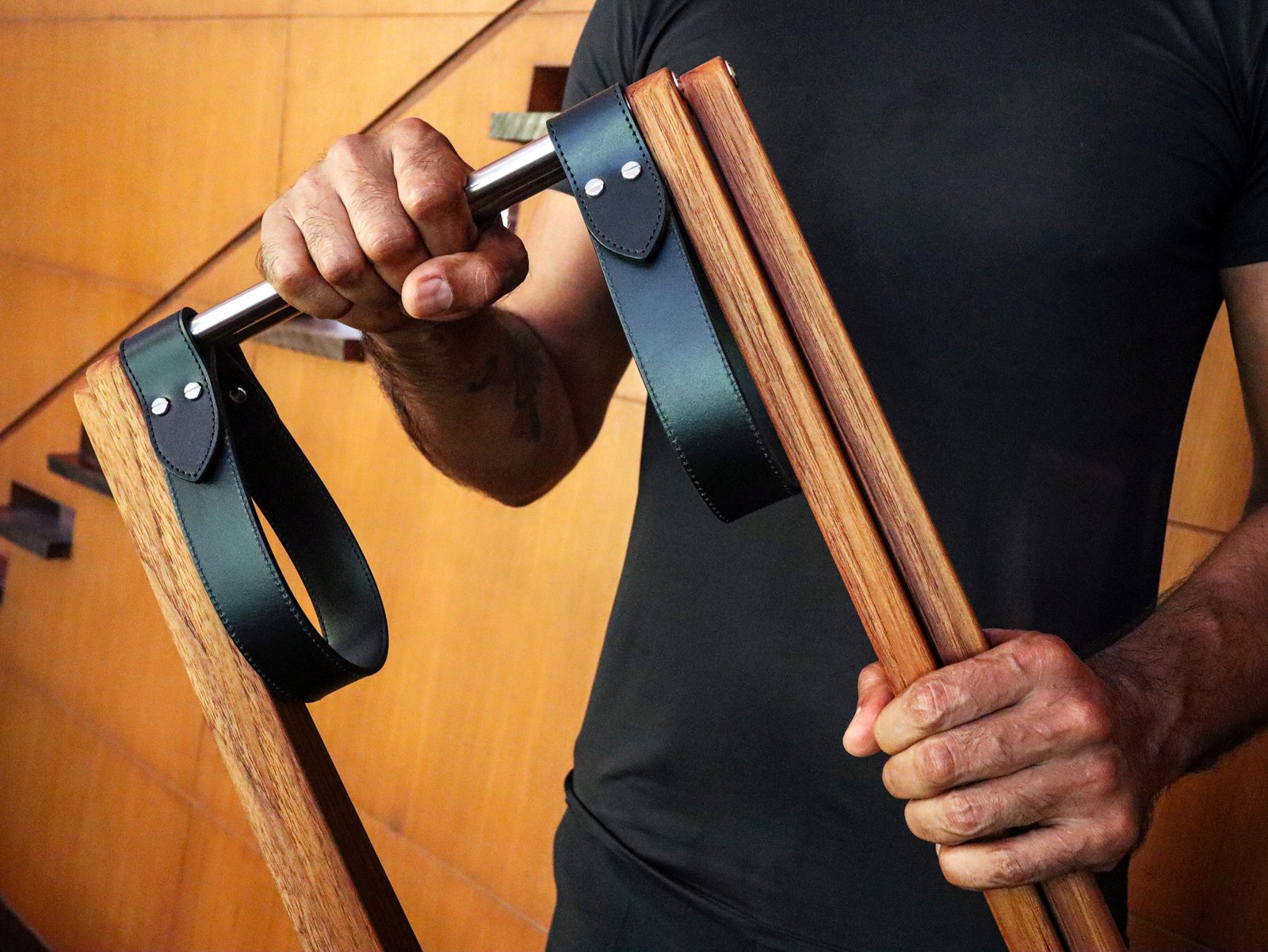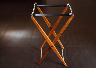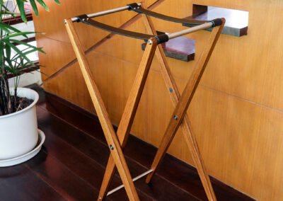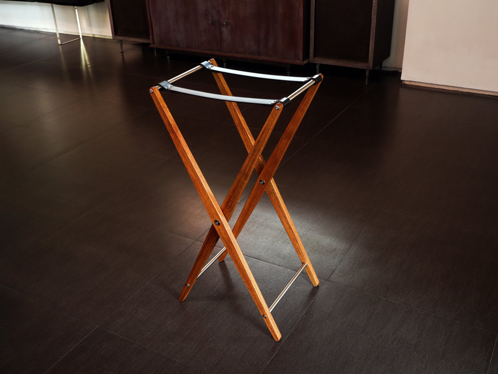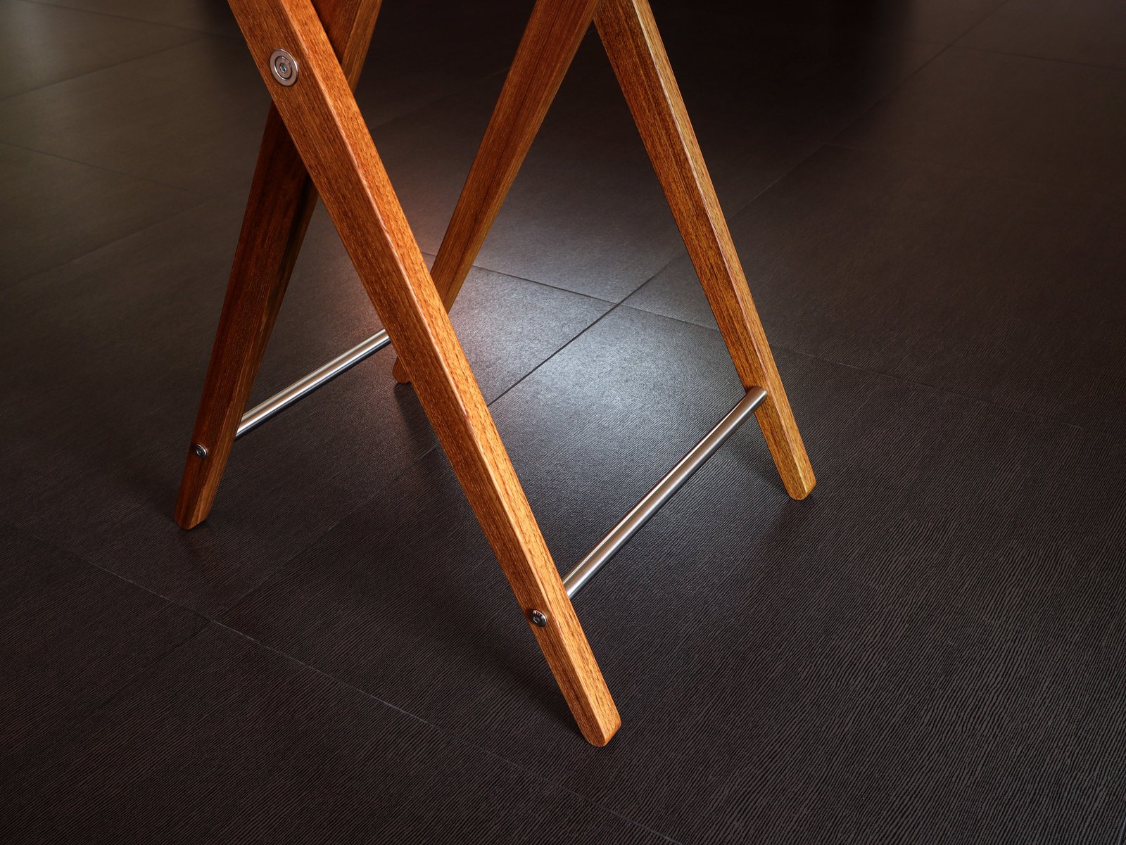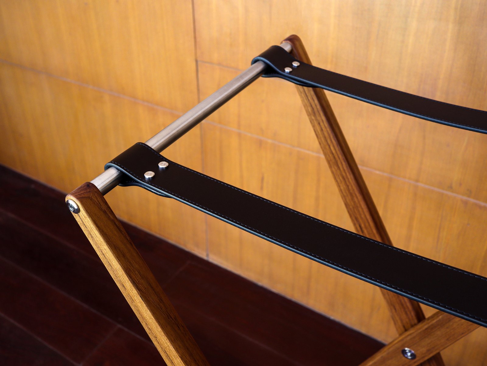 I chose polished stainless steel for its clarity and strength, finishing every surface to a mirror polish that recalls the exacting casework of a fine timepiece. The vegetable‑tanned leather straps, thick and resilient, are secured with stainless steel rivets set at precise pressure—functional details that also carry a tactile honesty. For the wooden elements, I used quarter‑sawn golden teak, selected for its stability and luminous grain, cut to reveal its natural precision and enduring beauty.