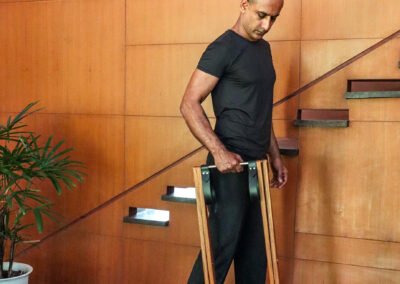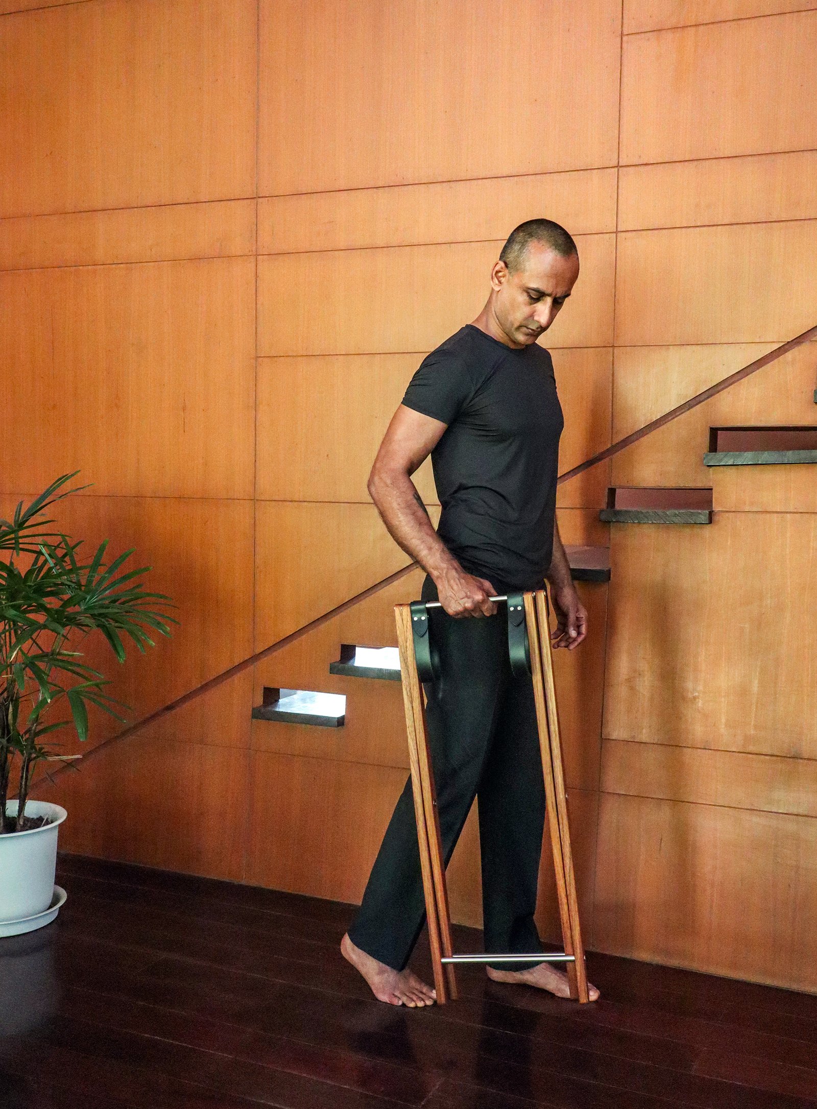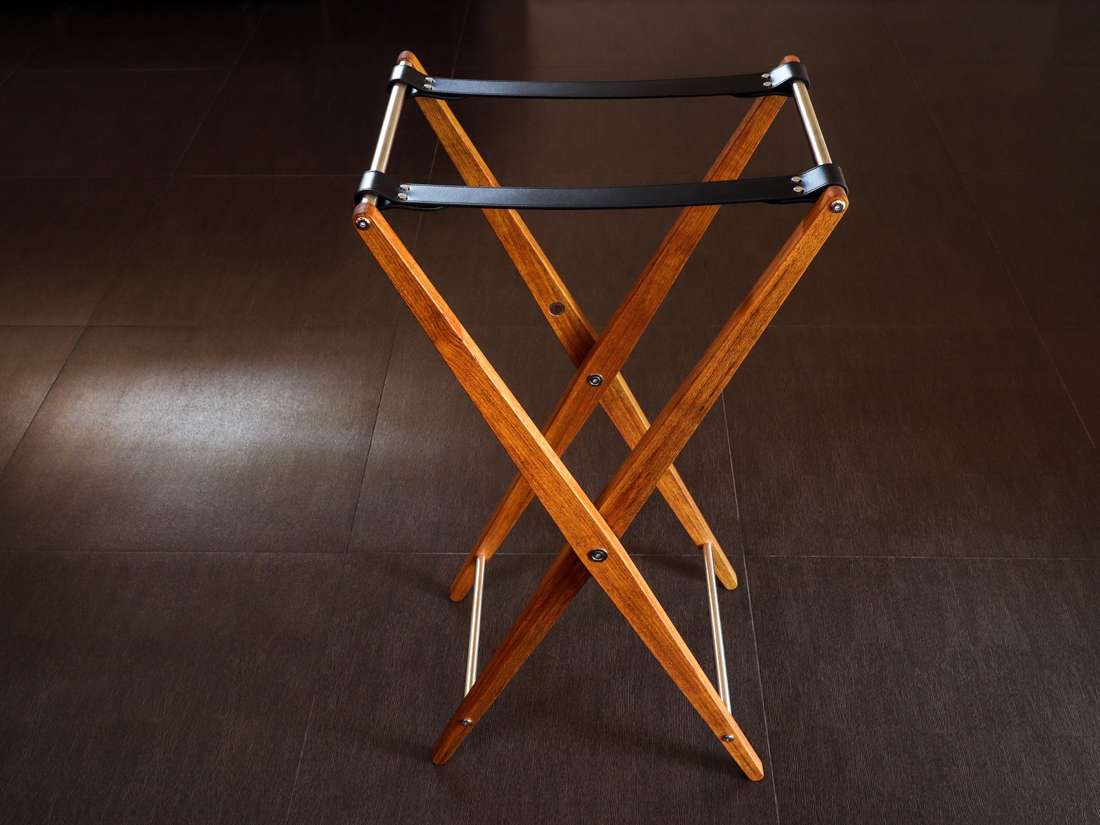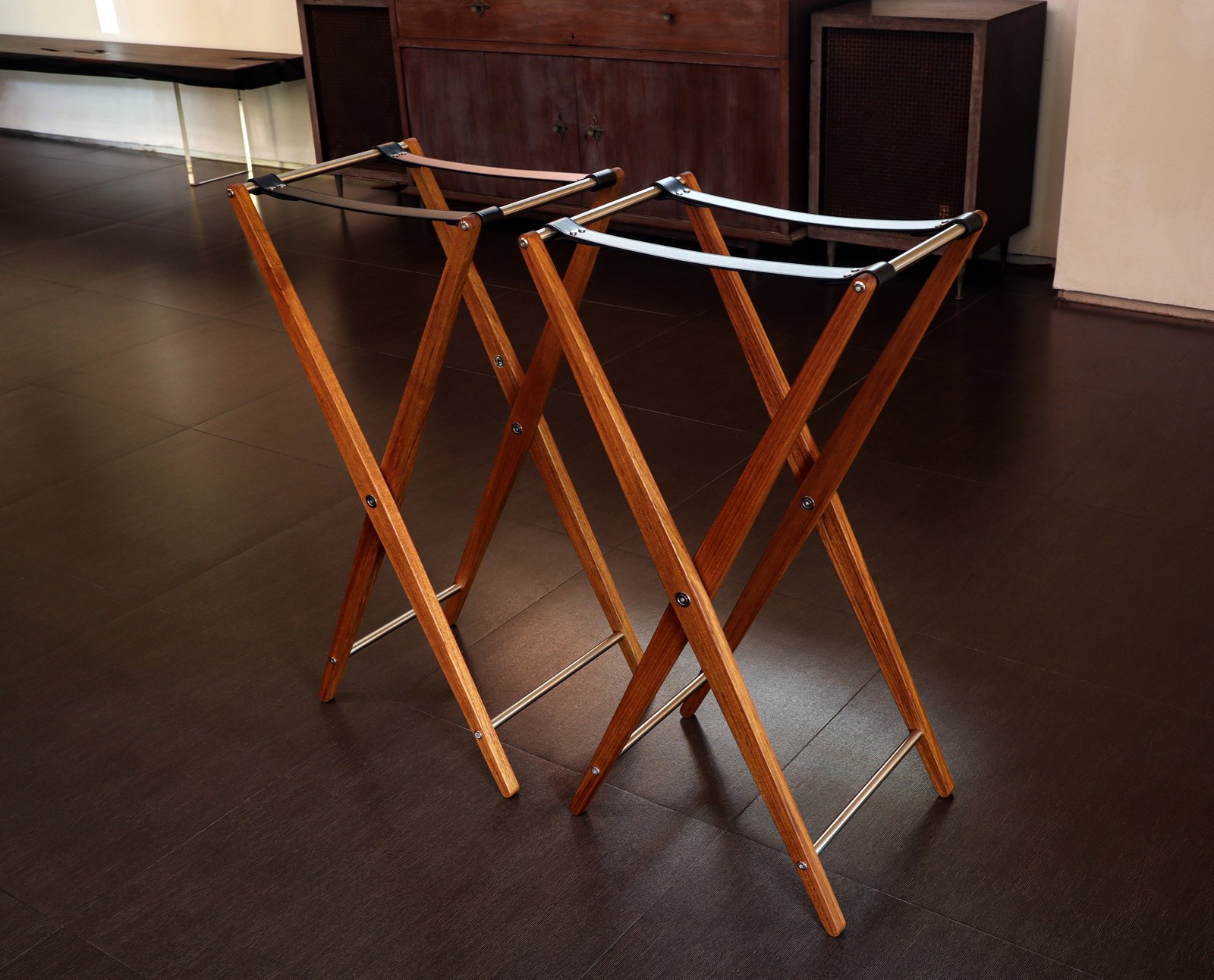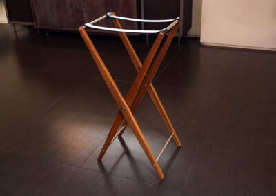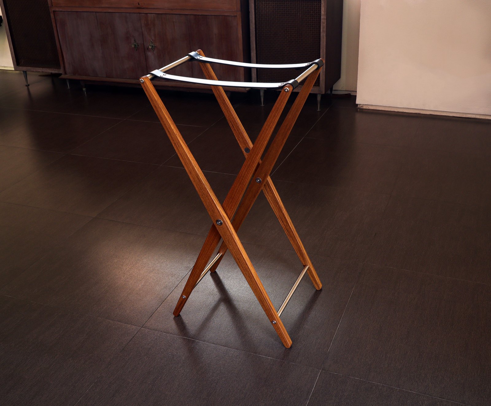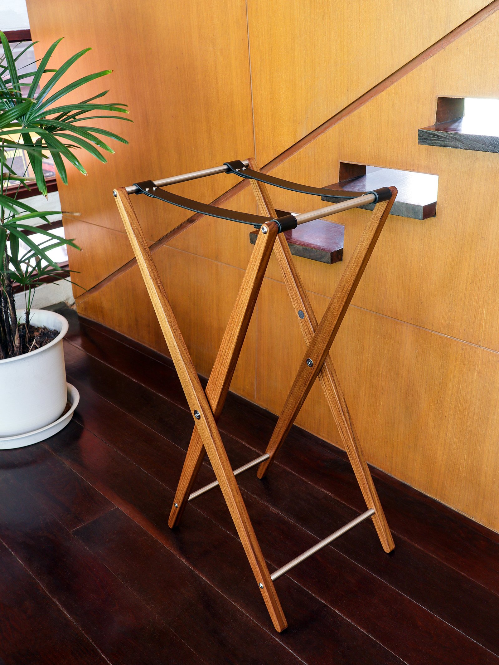 I chose polished stainless steel for its clarity and strength, finishing every surface to a mirror polish that recalls the exacting casework of a fine timepiece. The vegetable‑tanned leather straps, thick and resilient, are secured with stainless steel rivets set at precise pressure—functional details that also carry a tactile honesty. For the wooden elements, I used quarter‑sawn golden teak, selected for its stability and luminous grain, cut to reveal its natural precision and enduring beauty.